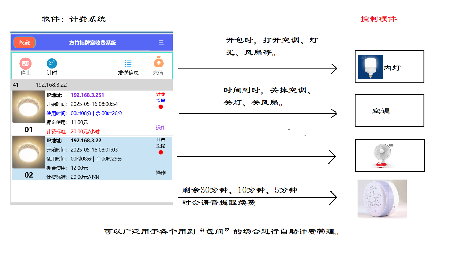 本系统分软件控制系统及硬件两部分。软件下载有需要的,请联系QQ:2607490或微信号:jingzu2008,申请时,在备注中请加上“软件咨询”字样。本软件功能:计费系统可以控制灯光、空调、风扇等。1:可以自助使用微信扫码自助开包间和充值。2:当还剩余30分钟、10分钟、5分钟时会用语音提醒充值。3:时间到后提醒并关掉灯光、空调、风扇等等电器。从而完全自动化管理。广泛应用于棋牌室、茶室、自习室、麻将馆、台球室、舞蹈室、乒乓球馆、网球馆、瑜伽馆、健身房、练琴房、沐浴房、睡眠舱、民宿酒店等场景。 软件:到官网论坛下载软件并安装。 软件费200元。1:软件分Android平版或手机程序及电脑版,直接下载安装好。只能安装一种,不能同时安装,否则会引起控制冲突。2:初次运行,设置一下默认押金,计费标准。3:然后点添加设备->界面出来后,点“寻找设备”,显示设备后,一个一个加入设备,并编号即可。 本系统分软件控制系统及硬件两部分。硬件:硬件有1:只控制灯光设备,功能单一,投资少。 每个点 需要100元。2:有同时控制灯光、空调、风扇等设备。还有语音功能,功能多,价格比第一种贵。 每个点要260元。3:只有语音功能,每个点100元。主要和第一个配合。 本系统分软件控制系统及硬件两部分。硬件配网连接WIFI:首先确保所有设备及计费系统在同一个路由器及网段,这样才能稳定的连接。通用配网方法:有按键的设备长按设备上面配网按键5-9秒放开让设备进入配网状态,如果没有按键的设备,找到设备板子上面的配网接口“IO12口+GND口”,用镊子或者导线短接这两个口5-9秒,让板子进入配网状态,注意:进入配网状态只能5-9秒,时间不能长也不能短。 一般设备上面蓝灯会有以下几种状态显示: 开关配网键为第一个开关。1. 设置未连接成功WiFi的时候一般设备上面的蓝灯会1秒闪烁一次2. 设备进入配网状态之后上面蓝灯是卡死状态,不会闪烁3. 设备配网成功之后设备上面蓝灯会长亮(6-8路设备可能是其它状态)配网方法也可以参考这个视频教程:教程地址。设备进入配网状态之后会发出一个“ESP”开头的热点信号,之后用手机WiFi(或者笔记本WiFi)连接这个热点信号,连接热点成功之后就会自动跳转到配网页面,根据页面提示操作配网即可,配网页面参考下图:点 配置WIFI-》选择一个WIFI连接,然后输入正确的密码就可以连接上了。然后,下载安装qibanfei.apk(可以在下载页扫描二维码下载安装),安装后,进行如下设置:手要安装好后,安卓和WINDOWS不同,在黑屏下退不计费,甚至被杀掉,所以需要一些设置:1:在手机上点这个程序图标几秒种,会显示菜单->点应用程序详情,然后点通知管理,允许通知打钩。2:返回,在“耗电管理”中->“完全允许后台行为”和“允许自动启动”打钩。这样,我们计费在黑屏下也能正常计费,且不会被杀掉。设置好后,就可运行我们的计费APP,点菜单-》添加设备-》点按钮“寻找设备”当显示设备后,就可以添加了。看下图注意:编号必需是01、02、03。。。。。。。99,为什么这样编号,因为等下我们用微信或支付宝扫码支付需要的对应支付二维码。这样加好后,就可以使用了。下面取微信收款码方法:收款码和包时的钱数一样,如包间是每个小时50元,则收款码就取50元的微信收款二维码。然后关键这里:01号的收款码是50.01元,02号的收款码为50.02,依次类推,。。。。。最后30号的收款码是50.30元。收款码取法请看这里:http://bbs.fangzu.com/read-120-1.html收款码取好后,用彩色打印机打印出来放在对应的号码上就可以了。这样,顾客来后,直接收码开包间,也可以直接收码充值。支付成功,都有语音提示。